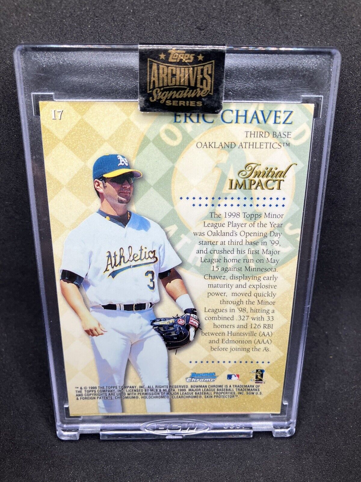 This 2022 Topps Archives Signature Series card features the autograph of Eric Chavez, a former Major League Baseball player for the Oakland Athletics. The card is a 1999 Bowman Chrome insert set with a print run of 1/1, making it a rare and valuable addition to any sports trading card collection.