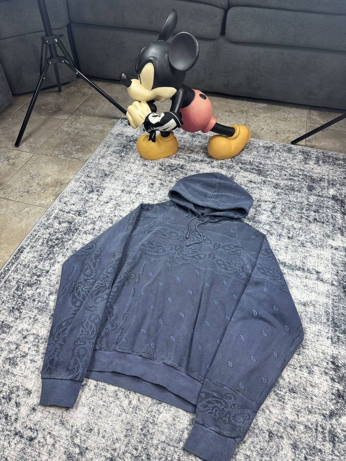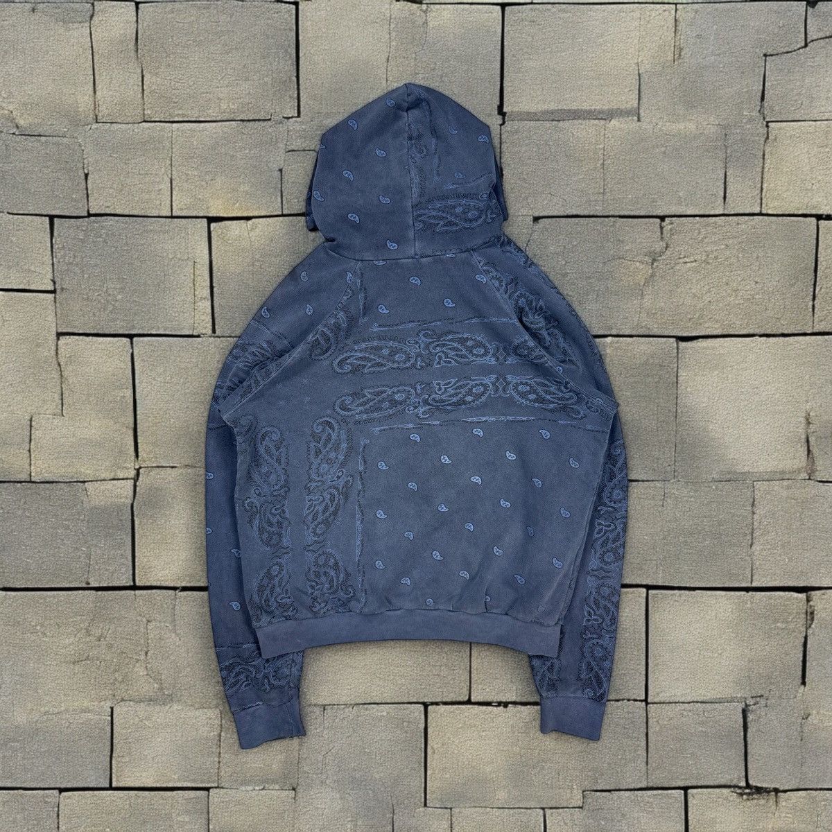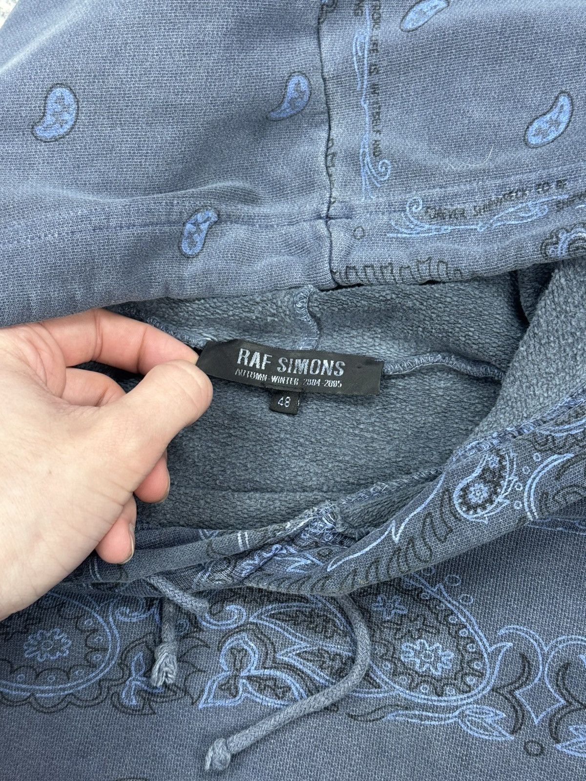 Debuting in Raf Simons Autumn-Winter 2004 collection entitled “Waves”, the paisley hoodie was presented in colors such as charcoal, blue, mint, orange, yellow and more. This hoodie is gently used with no major flaws.