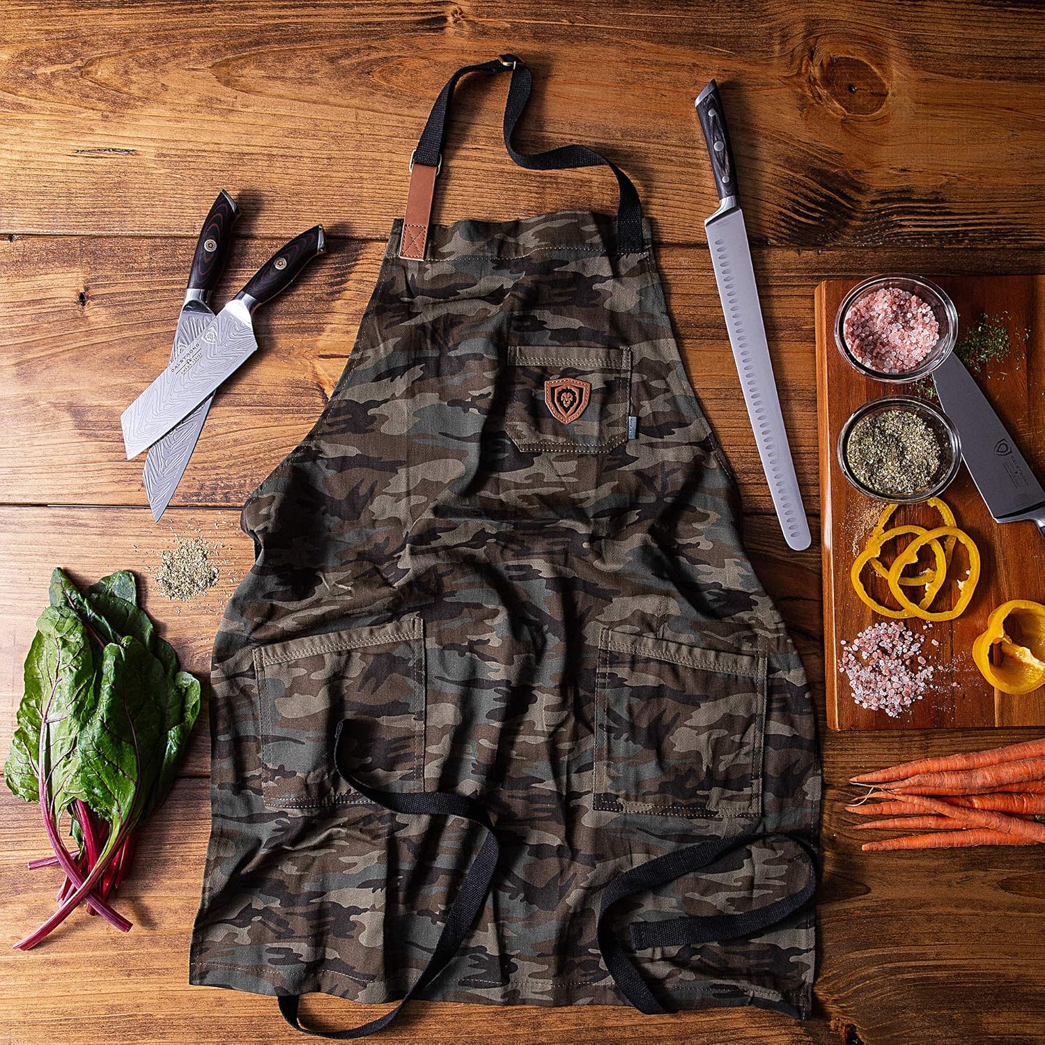 • Hand Crafted With Ultra-Premium Materials For Extra Durability. Thoughtfully designed with a rugged camouflage look, this light-weight apron is carefully crafted to function as smoothly as it looks. Featuring soft, breathable, lightweight, wrinkle-resistant, poly cotton, with genuine leather Dalstrong accents, double stitched pockets for military strength hold, thick top and bottom hems to preserve apron shape, and cotton webbing straps, this apron is built for kitchen warfare.