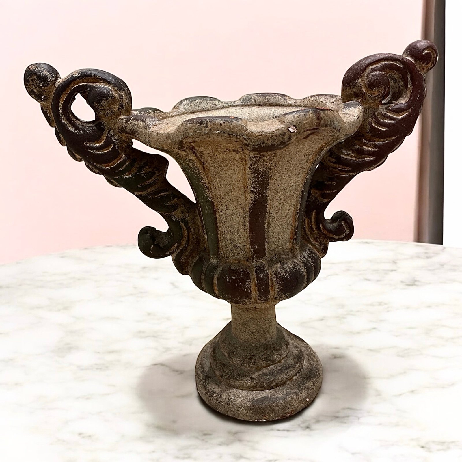 This vintage metal urn planter is a beautiful addition to any garden or indoor decor. The intricate scrollwork pattern and semicircle shape make it suitable for all occasions and suitable for outdoor decor. The planter vase with decorative handles is perfect for displaying your favorite flowers or plants.