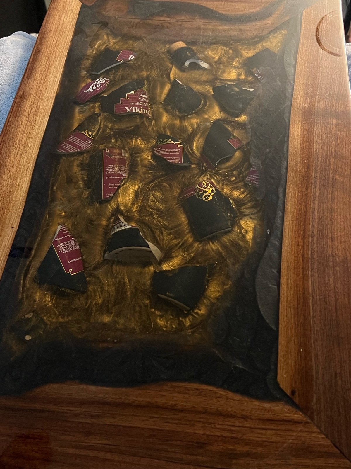 This particular item was designed and created to be wall art but is large enough that we can put legs on it instead of handles for you to use as an end table or small coffee table. The wood we used is walnut and it has a golden colored epoxy with a Vikings blood bottle in the middle. It’s a one of a kind piece!